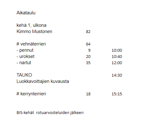 Lisäksi epäviralliset lisäkilpailut: paras pää, parhaat liikkeet ja paras turkki & väri