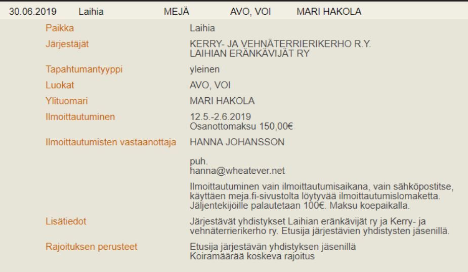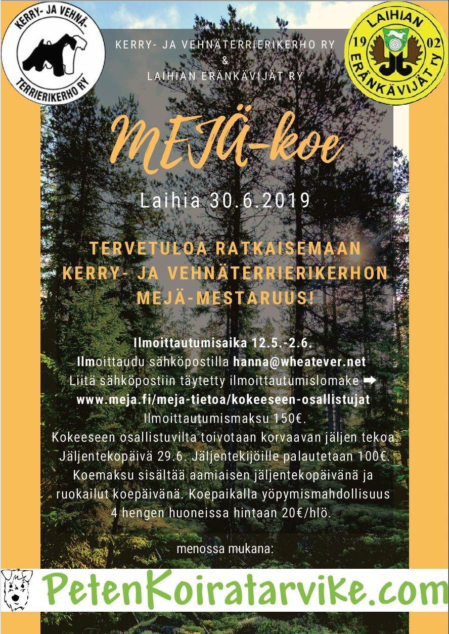 Kerry-ja Vehnäterrierikerho ry ja Laihian Eränkävijät ry järjestävät Mejä-kokeen 30.6.2019 Laihialla.